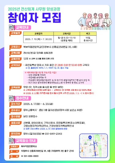 신청자 중 내부 심사에 의해 선정된 12명의 교육생은 북부 직업전문학교(의정부시 신흥로258번길 35)에서 오는 7월 10일부터 7월 30일까지 15일 동안 총 60시간의 전산회계 1급 자격증 취득 교육을 받게 되며 교육 수료 후 자격증 취득 및 취업 연계 일자리 상담 등 지원을 받는다.