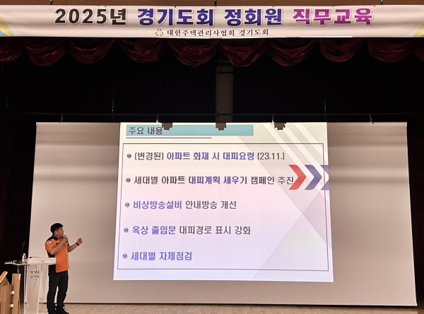 이번 교육에는 대한주택관리사협회 경기도회 소속 관리소장 등 150여 명이 참석했으며, ▲아파트 화재 시 대피요령 ▲세대별 대피계획 수립 캠페인 ▲비상방송설비 안내방송 개선 방안 ▲옥상 출입문 대피경로 표시 강화 ▲전기차 화재예방 요령 등이 안내됐다.