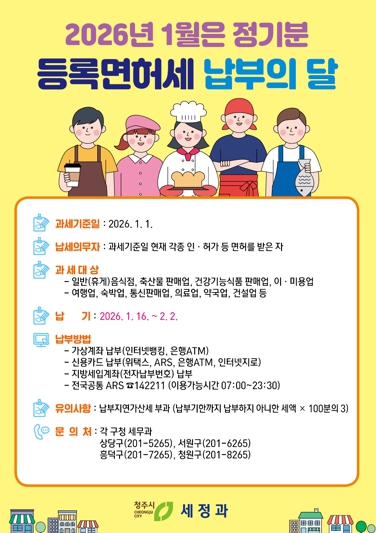 등록면허세 납세의무자는 2026년 1월 1일 현재 청주시에 주소 또는 사업장 소재지를 두고 각종 면허(허가·인가·영업신고 등)를 받은 개인 또는 법인으로, 면허 종류별로 등록면허세를 납부해야 한다.