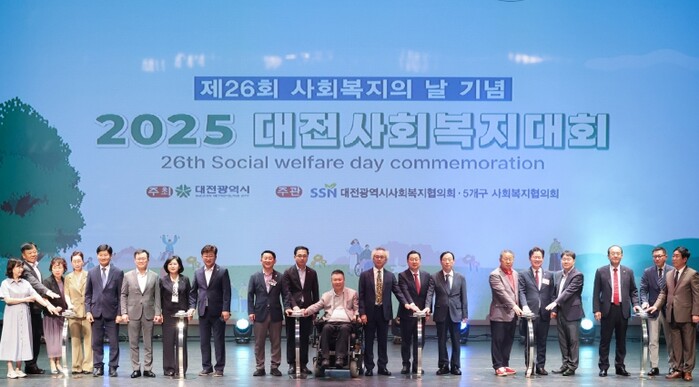 “사회 복지인의 사기 진작과 자긍심 고취에 힘써 나갈 것”대전시 “2025 대전사회복지대회 열려”[세계로컬타임즈] 대전광역시사회복지협의회(회장 김현채)는 9월 11일 오후 평송청소년문화센터에서 '2025 대전사회복지대회'를 개최했다. 이번 행사는 제26회 사회복지의 날을 기념해 사회복지 유관기관과 단체 관계자, 시민 등 500여 명이 참석한 가운데 진행됐다. 이날 행사에는 이장우 대전시장을 비롯해 시의회, 교육청 등 주요 인사들이 함께해 지역 복지인들의 노고를 격려했다.