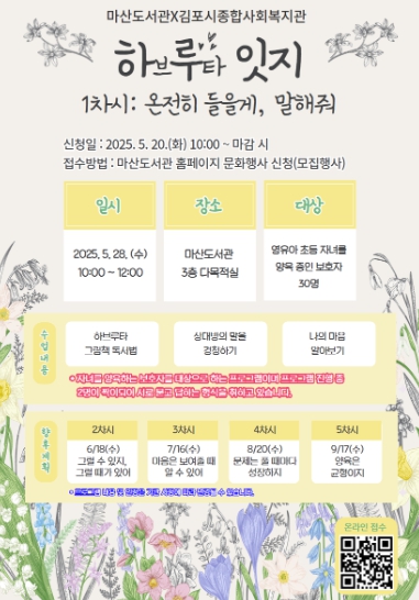 프로그램 참여 신청 및 일정은 매월 마산도서관 홈페이지를 통해 공지 예정이며, 1차시의 경우 5월 20일 오전 10시부터 마산도서관 홈페이지 문화행사 신청(모집/행사 부분)을 통한 온라인 접수와 마산도서관 1층 통합데스크 현장 접수로 진행할 예정이다.