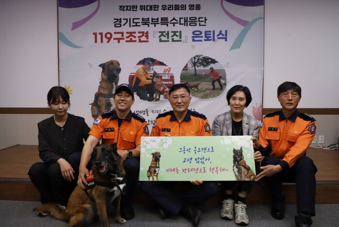 강대훈 북부소방재난본부장은 은퇴행사에서 “경기소방의 여덟 번째 구조견으로서 충실히 임무를 수행하고 퇴역하는 구조견 전진의 그간 수고를 치하한다”며 “반려견으로서도 행복하게 생활하길 바란다”고 말했다.