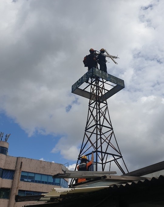 | ▲ 구조대원들이 교회철탑 십자가를 안전조치하고 있다.(사진=광명소방서 제공) |