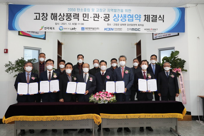 [세계로컬타임즈 김봉관 기자] 전북 고창군이 6일 오전 상하면 강선달권역 미감쾌청 문화공간에서 전북 서남권 해상풍력의 순조로운 출범을 알리는 ‘고창 해상풍력 민·관·공 지역상생 협약’을 체결했다.