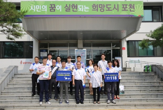 | ▲ 김영길 포천시 홍보감사담당관(앞줄 왼쪽에서 세번째)이 지난 12일 개인 정보보호 캠페인을 벌인 후 참석자들과 기념촬영하고 있다.<사진제공=포천시청> |