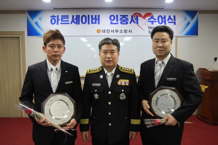 | ▲ (왼쪽부터)대전서부소방서 민정환 소방교, 이선문 소방서장, 명관 소방위가 하트세이버 인증서 수여식을 갖고 기념촬영하고 있다. |