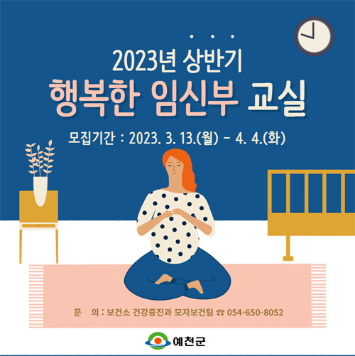 [세계로컬타임즈 이장학 기자] 경북 예천군이 오는 4월 4일까지 임신부 및 예비 임신부를 대상으로 ‘행복한 임신부 교실’ 참여자를 모집한다.