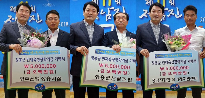 광주은행 장흥지점은 지난해까지 3회에 걸쳐 총 3500만원의 장학금을 기탁했고 장흥군 산림조합 역시 6회에 걸쳐 총 1억1500만원의 장학금을 기탁하는 등 꾸준한 지역사랑을 실천하고 있다.