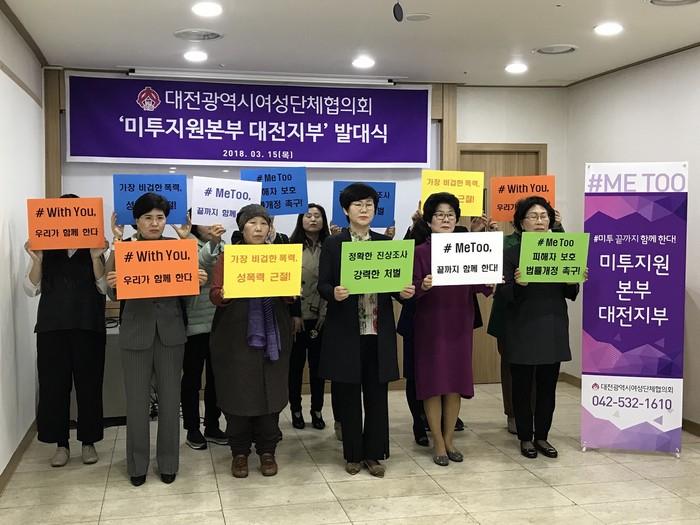 미투지원본부 대전지부와 함께할 단체는 대전여성변호사회와 한국여성변호사회, 한국심리학회, 한국공법학회, 대한가정법률복지상담원 등이다.