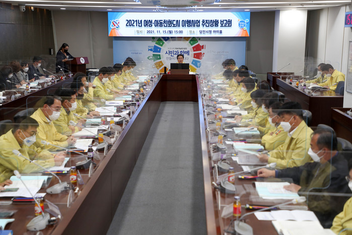 [세계로컬타임즈 홍윤표 조사위원] 당진시가 15일 시청 아미홀에서 김홍장 시장을 비롯한 29개 부서장 등 50여명이 참석한 가운데 ‘2021년 여성‧아동친화도시 추진상황’ 보고회를 개최했다.