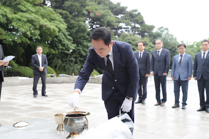| ▲ 정장선 평택시장이 2일 오전 평택호 현충탑 참배를 하고 있다. <사진제공=평택시> |