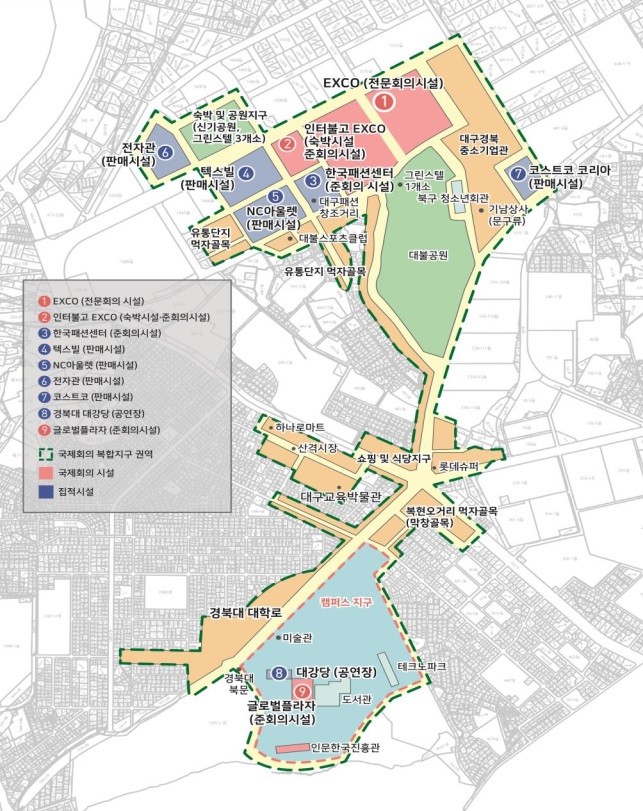 경북대학교 · 엑스코 · 컨벤션뷰로 등 지역 마이스 업계가 함께 참여해 집적시설 간 업무협약을 체결하고 실무협의회를 개최하는 등 국제회의 복합지구 지정을 위해 상호 지속적인 협력관계를 이어왔다.