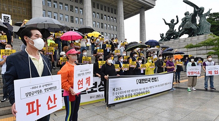 | ▲ 지난달 28일 서울 여의도 국회 본청 앞에서 정의당과 피해상인들이 손실보상법 소급적용 촉구 결의대회를 진행하고 있다.(사진=뉴시스) |