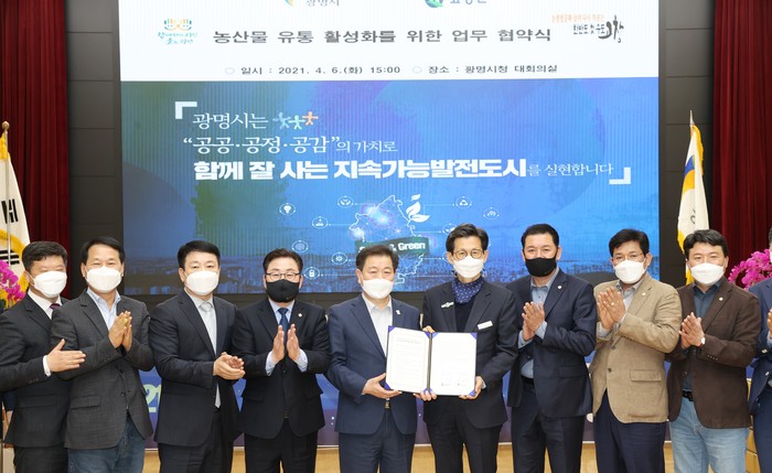 | ▲6일 광명시청에서 친환경 농산물유통 활성화를 위한 업무 협약식 후 기념 촬영을 하고 있다. (사진=광명시 제공) |