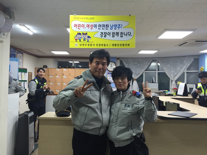 | ▲ 간담회 중 쓰러진 노인을 신속하게 후송해 생명을 구한 이경재 경위(왼쪽)와 임소망 경장이 사무실에서 기념촬영하고 있다.<사진제공=남양주경찰서> |