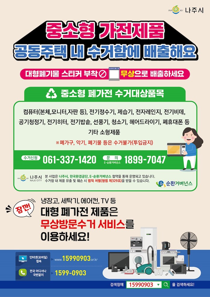 나주시(시장 윤병태)는 자원순환 활성화와 가정 내 중·소형 폐가전제품 배출 편의를 위한 전용 수거함을 공동주택 30개소에 보급한다고 15일 밝혔다.