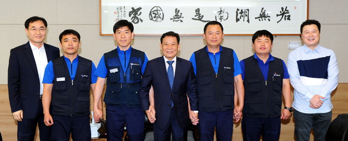 | ▲ 윤장현 광주광역시장(가운데)이 지난 12일 금호타이어 상임 노조원들과 면담한 후 손을 잡고 기념촬영하고 있다.<사진제공=광주시청> |