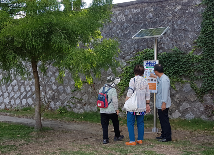 | ▲ 대구시 남구청이 설치한 해충기피제 자동분사기에 적힌 안내문을 시민들이 읽고 있다. <사진제공=대구시 남구청> |