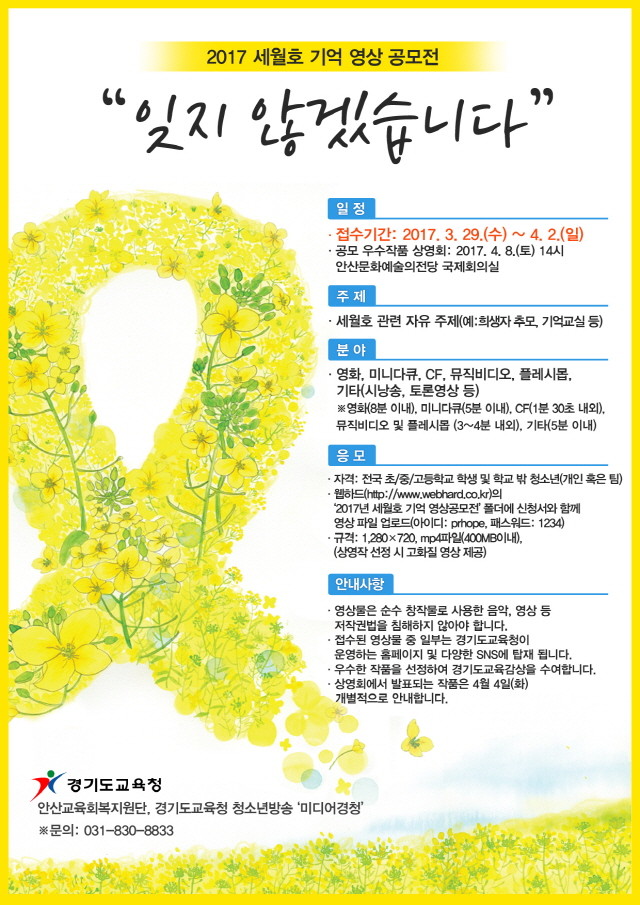 [세계로컬신문 김수진 기자] 경기도교육청은 세월호 참사 3주기를 맞아 영상 공모전을 개최한다고 20일 밝혔다.