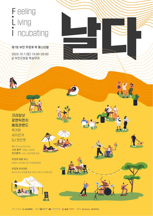 19일 부안군에 따르면 부안군문화재단(이하 ‘재단’)은 장애인의 문화예술에 대한 접근성을 높여 장애인과 비장애인이 함께 즐길 수 있는 환경을 조성하는 ‘제1회 부안 무경계 락 페스티벌 날다(F.L.I)’를 10월 7일 부안군청 앞에서 개최한다.