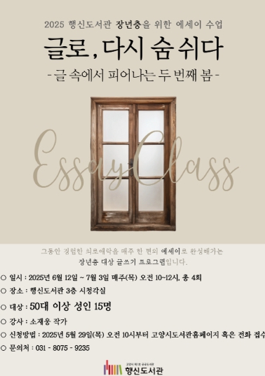프로그램 신청은 5월 29일 오전 10시부터 고양시 도서관 누리집을 통해 할 수 있으며, 50대 이상 성인 15명을 선착순으로 모집한다.