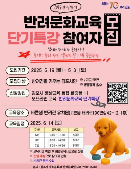 모집대상은 동물등록이 완료된 반려견을 키우는 김포시민으로, 모집인원은 15명이다. 참여를 원하는 자는 김포시 평생교육 통합 플랫폼 ‘오프라인 교육’에서 신청하면 되고, 반별 추첨을 통해 최종 참여자를 선정할 예정이다.