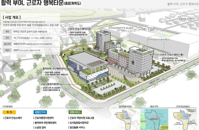 부여군은 규암면 오수리 일원에 2025년부터 2029년까지 국토부 및 문체부 지원사업 등 총 268억원을 투입해 근로자 행복타운을 조성한다.
