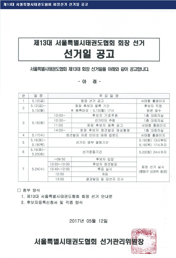 | ▲ 서울시태권도협회 홈페이지에 공지된 선거 공고문. <제공=서울시태권도협회> |