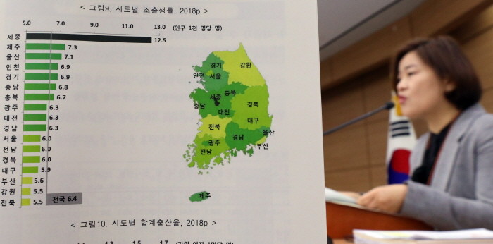 | ▲ 김진 통계청 인구동향과장이 지난 2월 27일 정부세종청사에서 합계 출산율 0.98명으로 사상 최저를 나타낸 ‘2018년 출생·사망통계 잠정 결과’를 발표하고 있다.(사진=뉴시스) |
