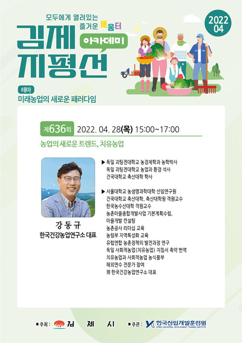 [세계로컬타임즈 조주연 기자] 전북 김제시가 오는 28일 강동규 한국건강농업연구소 대표를 제636회 지평선아카데미에 초청해 ‘농업의 새로운 트렌드, 치유농업’이란 주제로 강연을 진행한다.