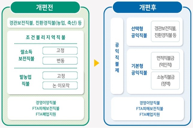 공익직불제 세부 시행방안은 현행 쌀직불·밭고정·조건불리직불제를 ‘기본형 공익직불제’로 통합하고 친환경직불, 경관보전직불 등은 ‘선택형 공익직불제’로 유지한다.