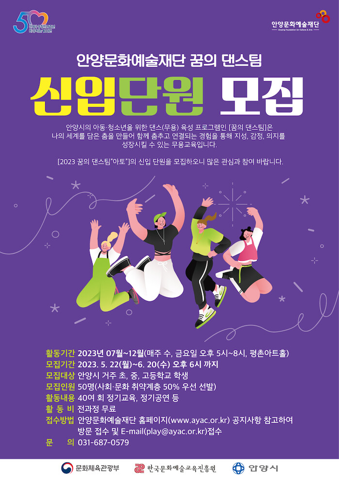 재단은 한국문화예술교육진흥원이 주관하는 ‘2023 꿈의 댄스팀 거점 공모사업’에 선정됨에 따라 다음달 20일까지 신입 단원 50명을 모집한다.