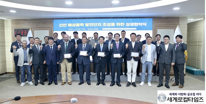 [세계로컬타임즈 김명진 기자] 전남 신안군이 “20일 전남도청 서재필실에서 김영록 전남도지사, 박우량 신안군수, 김장수 신안군어업인연합회장, 이도명 (사)신안해상풍력발전사협의체위원장, OW코리아㈜)와 함께 ‘신안 해상풍력 발전단지 조성을 위한 상생협약’을 체결했다”고 밝혔다.