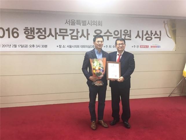 [세계로컬신문 김정태 기자] 서울시의회 환경수자원위원회 최조웅 의원(더불어민주당ㆍ송파6)이 지난 17일 서울시의회 의원회관 2층 대회의실에서 열린 ‘2016년 행정사무감사 우수의원 시상식’에서 우수의원으로 선정돼 수상했다.
