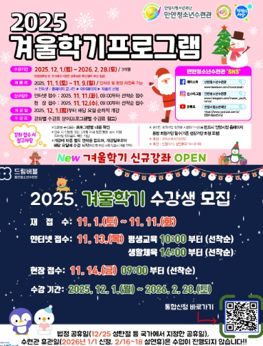 만안청소년수련관은 12월 1일부터 2026년 2월 28일까지 겨울학기 프로그램을 운영하며, 이번 학기에는 총 124개 강좌 225개 반이 개설되어 배드민턴, 탁구 등 체육활동부터 역사·과학·영어·요리·피아노 등 다양한 분야의 교육 콘텐츠를 제공한다.