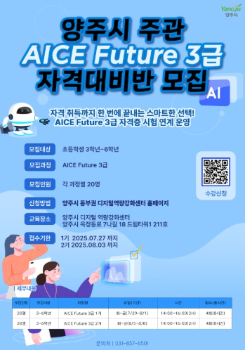 양주시 미래교육과장은 “이번 자격증 과정을 통해 학생들이 미래사회에 필요한 디지털 소양과 자기주도적 학습 역량을 키우는 계기가 되길 바란다”며, “앞으로도 다양한 연령과 수준에 맞춘 디지털 교육 프로그램을 지속적으로 확대해 나가겠다”고 밝혔다.