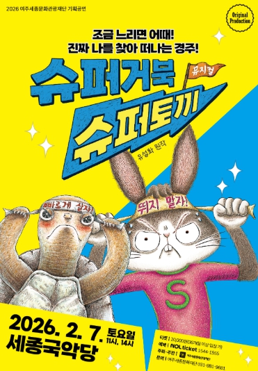 ‘슈퍼거북 슈퍼토끼’는 동화작가 유설화의 베스트셀러 그림책 ‘슈퍼거북’과 ‘슈퍼토끼’를 원작으로 한 창작 뮤지컬이다. 이솝우화로 우리에게 익숙한 ‘토끼와 거북이’의 뒷이야기를 상상력으로 확장해, 끝나버린 경주 후 변화된 환경에 놓인 토끼와 거북이의 삶을 흥미로운 시선으로 풀어낸다. 단순한 교훈을 넘어 등장인물들의 처지와 선택을 돌아보게 하는 구성이 특징이다.