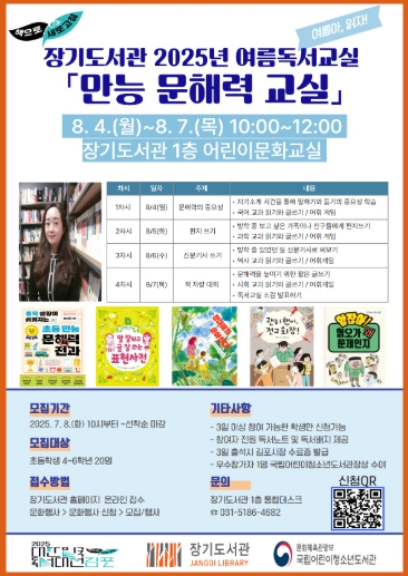 강의 신청은 7월 8일 오전 10시부터 장기도서관 홈페이지에서 온라인으로 신청할 수 있으며 관내 초등학교 4~6학년 20명을 선착순 모집한다.