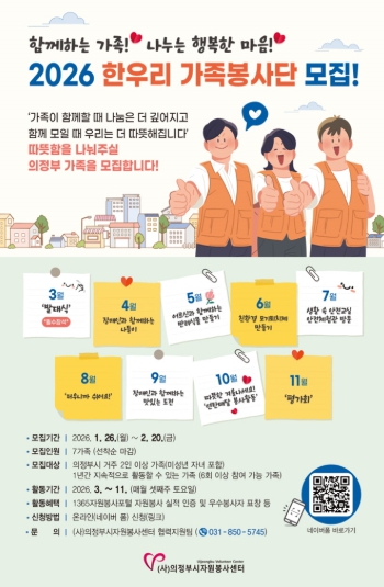 이번 한우리가족봉사단 모집은 의정부시 거주 가족 증가에 따른 봉사 수요 확대에 맞춰 3년 만에 재개되는 것으로 오는 3월 발대식을 시작으로 장애인 나들이 지원, 어르신 보조활동, 안전체험, 연탄 배달 등 다양한 활동을 11월까지 진행할 예정이다. 참여를 희망하는 의정부시 거주 가족은 오는 2월 20일까지 선착순으로신청할 수 있다.