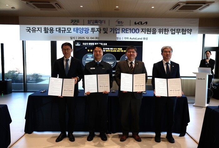이번 협약은 아산국가산업단지 우정지구인 기아오토랜드(화성) 내 국유지에 50MW 규모의 자가소비형 태양광 발전소와 에너지저장장치(ESS)를 설치하는 내용이다. 기아는 공장 가동에 필요한 에너지를 재생에너지로 대체하고 경기도와 화성시, 한국자산관리공사는 기아의 RE100 이행을 지원하게 된다.