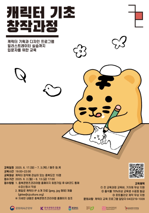 신청을 희망하는 사람은 충북콘텐츠코리아랩 누리집또는 포스터 내 QR코드를 통해 수강 신청서를 제출하고, 본인의 캐릭터 IP 소개 자료를 이메일로 보내면 된다.