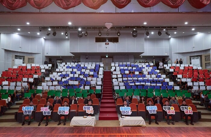행사는 공직자 대표 2인의 청렴 실천 결의문을 낭독으로 시작됐다. 이어 전 직원이 참여해 부패방지, 청렴다짐 문구를 형상화한 카드 섹션 퍼포먼스로 이어지며 현장의 분위기를 고조시켰다.
