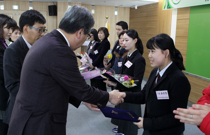 | ▲대전 동구 차세대 인재로 선정된 한 학생이 장학증서를 받은 뒤 장학재단 관계자와 악수를 나누고 있다. <사진제공=대전 동구청> |