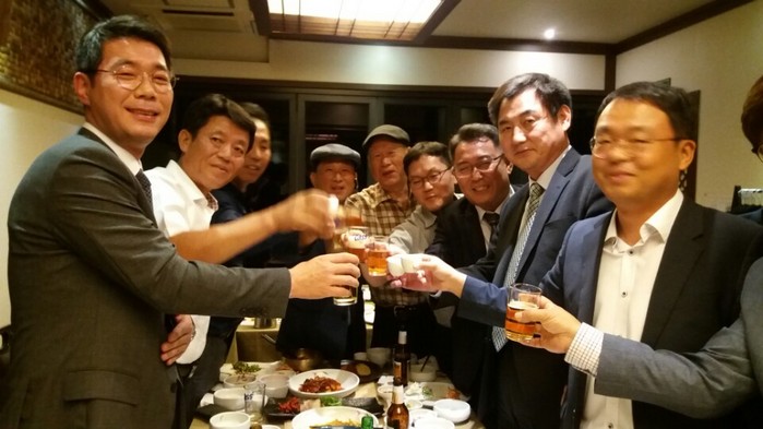 | ▲ 지난 4일 서울 서초구의 한 음식점에서 열린 세계일보 중앙위원회 월례회의에서 중앙위원들이 신임 장성훈 위원(왼쪽)을 축하하기 위해 건배를 하고 있다. |