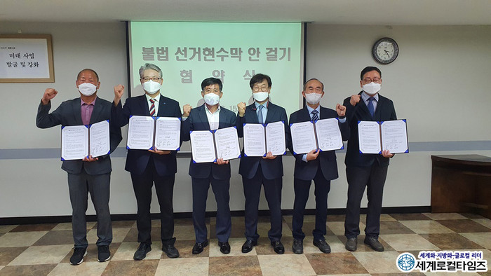 [세계로컬타임즈 조주연 기자] 내년 6·1 지방선거 김제시장 출마 예정자 5인이 불법 선거 현수막 안 걸기에 합의했다.