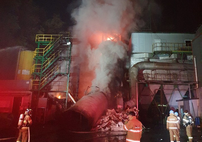 | ▲동두천시 쓰레기처리시설에서 28일 새벽 화재가 발생해 소방대원들이 진화작업을 벌이고 있다. (사진=동두천소방서 제공) |