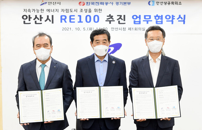 이번 협약에 따라 안산시는 기업의 RE100 달성을 위해 법령과 조례가 정한 범위 내에서 적극 지원하고, 한전 경기본부는 안산의 전력망 제공과 RE100 이행수단 계약을 지원하며, 안산상공회의소는 회원정보 제공 및 RE100 참여기업 홍보 지원 등에 나선다.