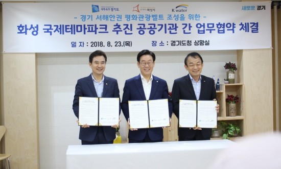 이재명 경기도지사, 서철모 화성시장, 이학수 한국수자원공사 사장은 경기도청에서 국제테마파크 정상화를 위한 협약서에 서명하고 협약식에 참석한 주민들과 화성 국제테마파크의 성공적 추진을 다짐했다.