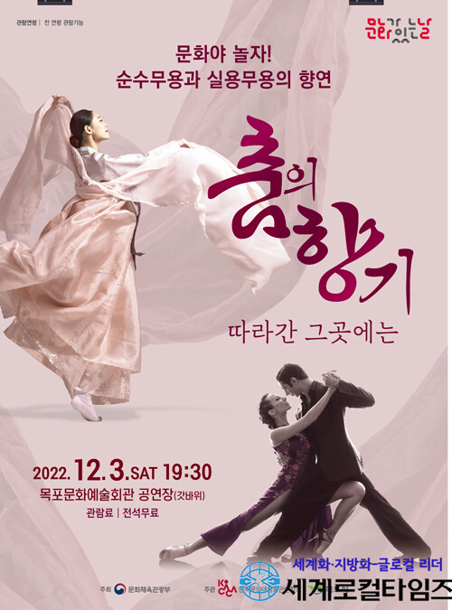 [세계로컬타임즈 김명진 기자] 전남 목포문화예술회관에서 오는 12월 3일 ‘문화야 놀자! 순수무용과 실용무용의 향연, 춤의 향기 따라간 그곳에는’이 공연된다.