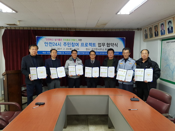 [세계로컬신문 고성철 기자] 경기도 남양주시 조안면사무소는 지난 23일 조안면 사회단체장과 조안파출소장이 참석한 가운데 ‘안전24시 주민참여 프로젝트’ 업무 협약식을 가졌다.
